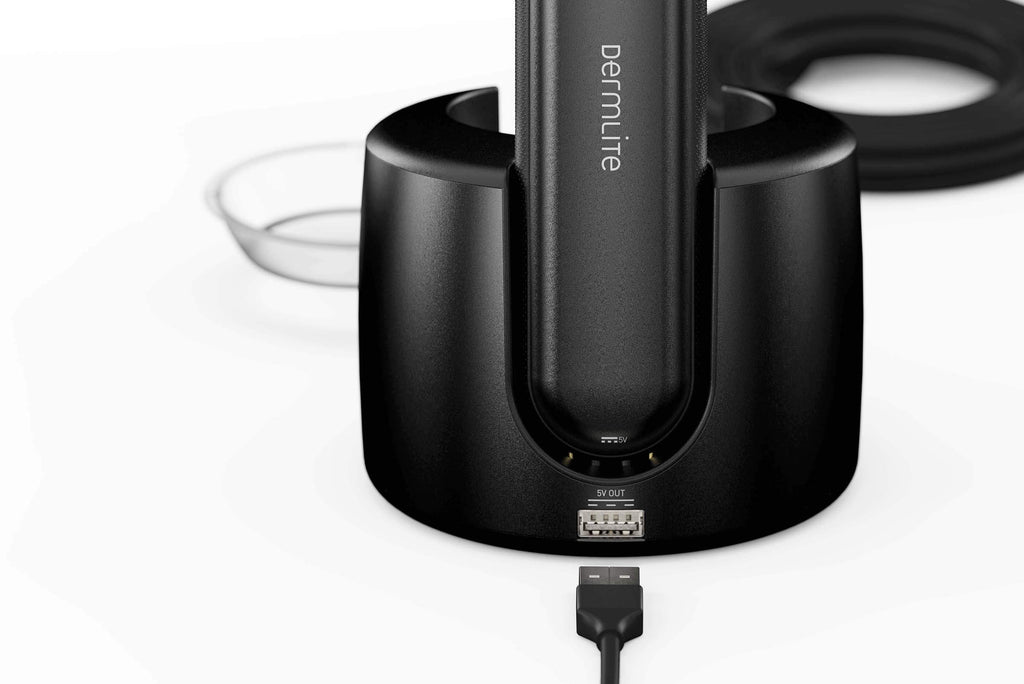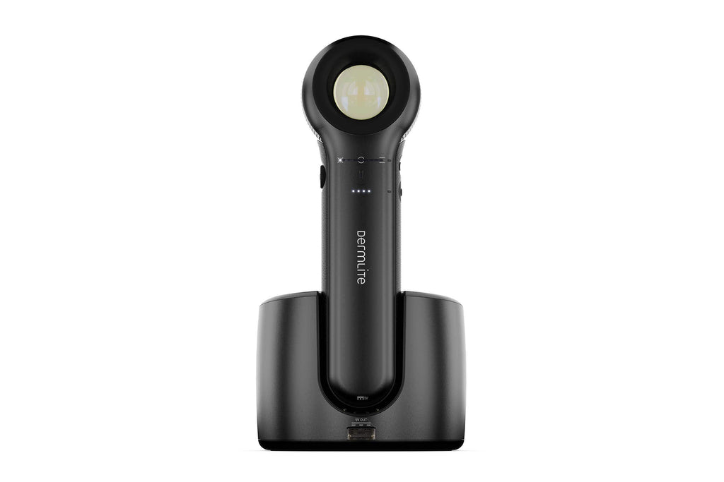 DL5 lets you work substantially longer on a single charge, thanks to a battery that’s more than twice the capacity of DL4. Between uses, keep it charged up on the included desktop charging base — which doubles as home base for your IceCap® supply. You’ll even be able to charge a second DermLite or your phone using its front-facing 5V USB port or use the supplied USB-C cable while on the go; regardless, DL5’s 4-level charge indicator keeps you up to date.
